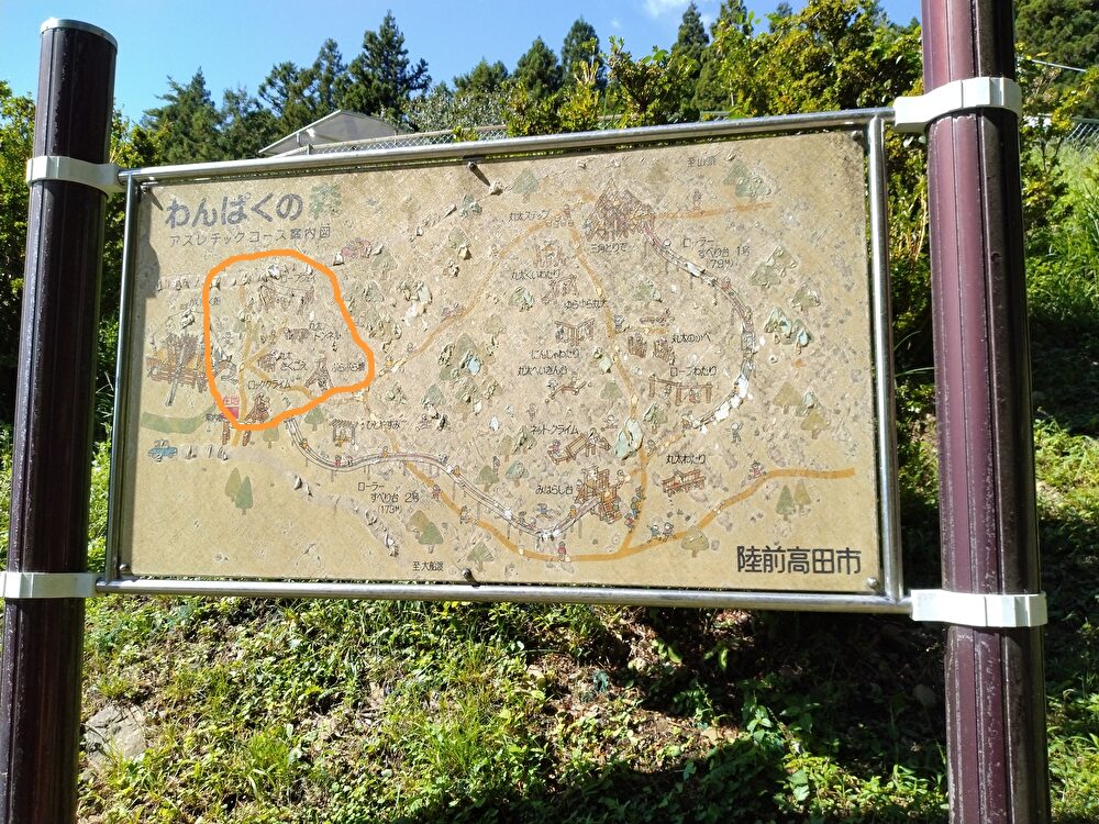かいぞく船のほかに現在使用できるアスレチック遊具は、オレンジの線で囲った部分の遊具です。