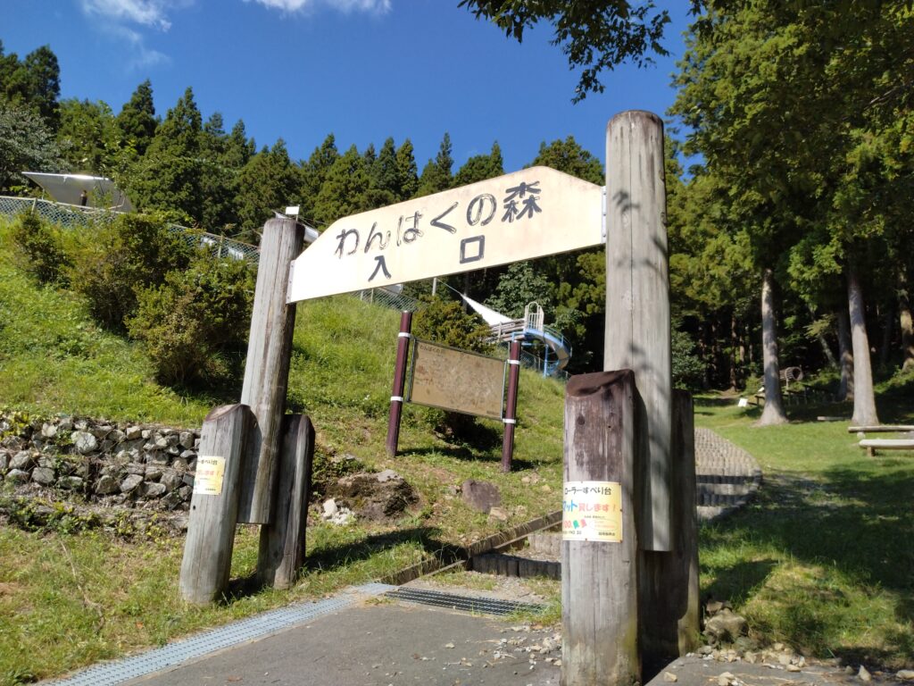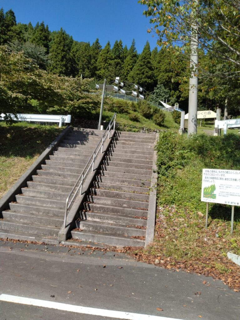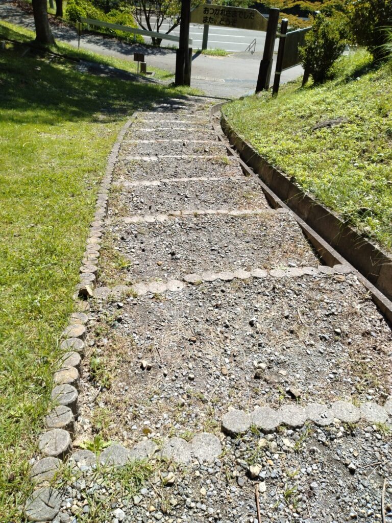 駐車場から、階段をのぼった先がわんぱくの森の入り口です。