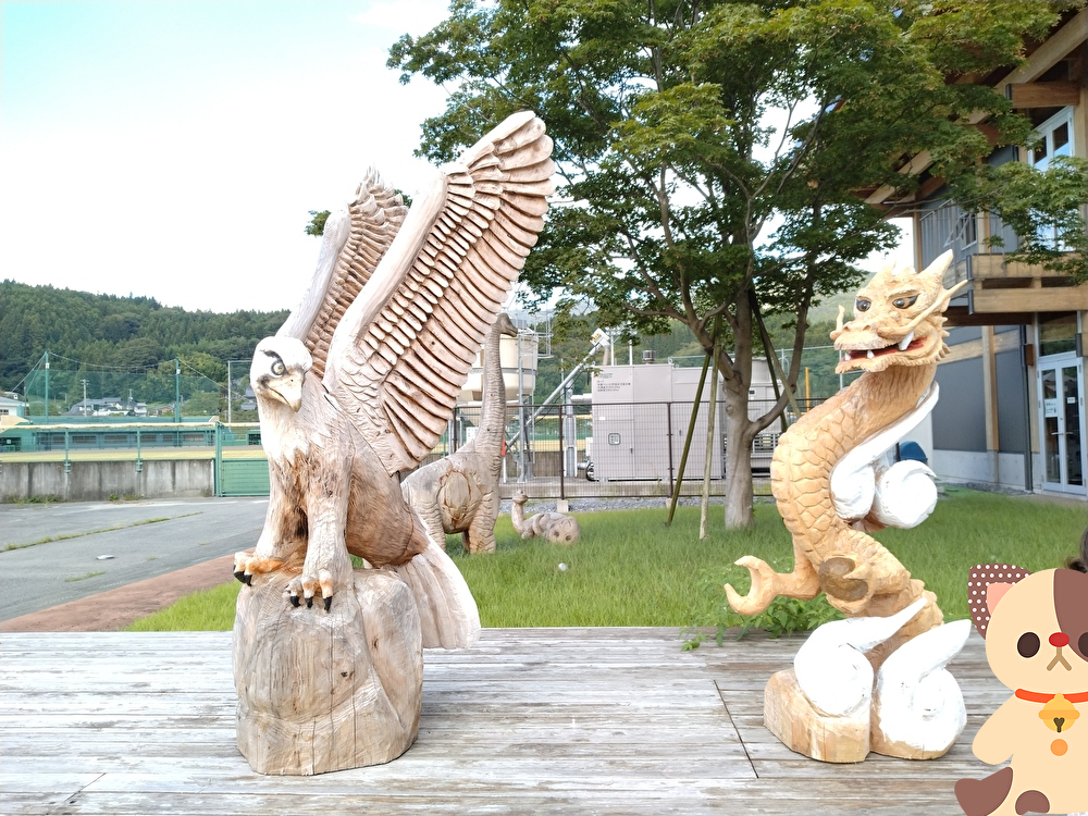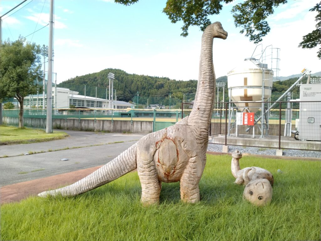 野球場駐車場(駐車料金無料)近くに、恐竜や竜の木のオブジェが設置されています。